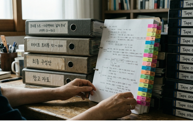 1. 고치- 나비가 될 수 있을까. 지금은 촬영에도 외장 하드가 사용되지만, 내가 한창 다큐멘터리를 만들던 시절엔 ‘촬영 테이프’라는 것이 있었다. 보통 1시간짜리 다큐멘터리를 제작하면 60분에서 90분 짜리 테이프가 100개에서 150개 정도 쌓였다. 촬영 기간이 길어지거나 대작(大作 )인 경우엔 이 개수를 훨씬 뛰어넘기도 했다. 촬영이 끝나면 영상을 문자로 옮기는 ‘프리뷰 작업’에 들어간다. 촬영 영상의 내용과 현장음, 그리고 인터뷰를 기록한 프리뷰 노트는 프로그램의 뼈대를 만드는 기본 데이터다. 촬영 시간과 현장음의 밀도 그리고 인터뷰의 길이에 따라 테이프 1개당 A4 용지 30장 분량이 쏟아지기도 했다. 그렇게 100개에서 150개의 프리뷰가 쌓이면, 두꺼운 백과사전 두세 권에 맞먹는 분량이 된다. 작가는 촬영테이프와 프리뷰 노트를 앞에 두고, 이야기를 짜기 위한 면밀한 분석에 들어간다. 나는 이 지난한 작업에 들어가기 전, 반드시 하나의 의식을 치르곤 했다. 프리뷰 노트 가장자리에 촬영 테이프 번호에 맞춰 필름 플래그를 붙이는 일이었다. 작가들은 이 필름플래그를 ‘나비’라고 불렀다. by서사이_도구의 사생활